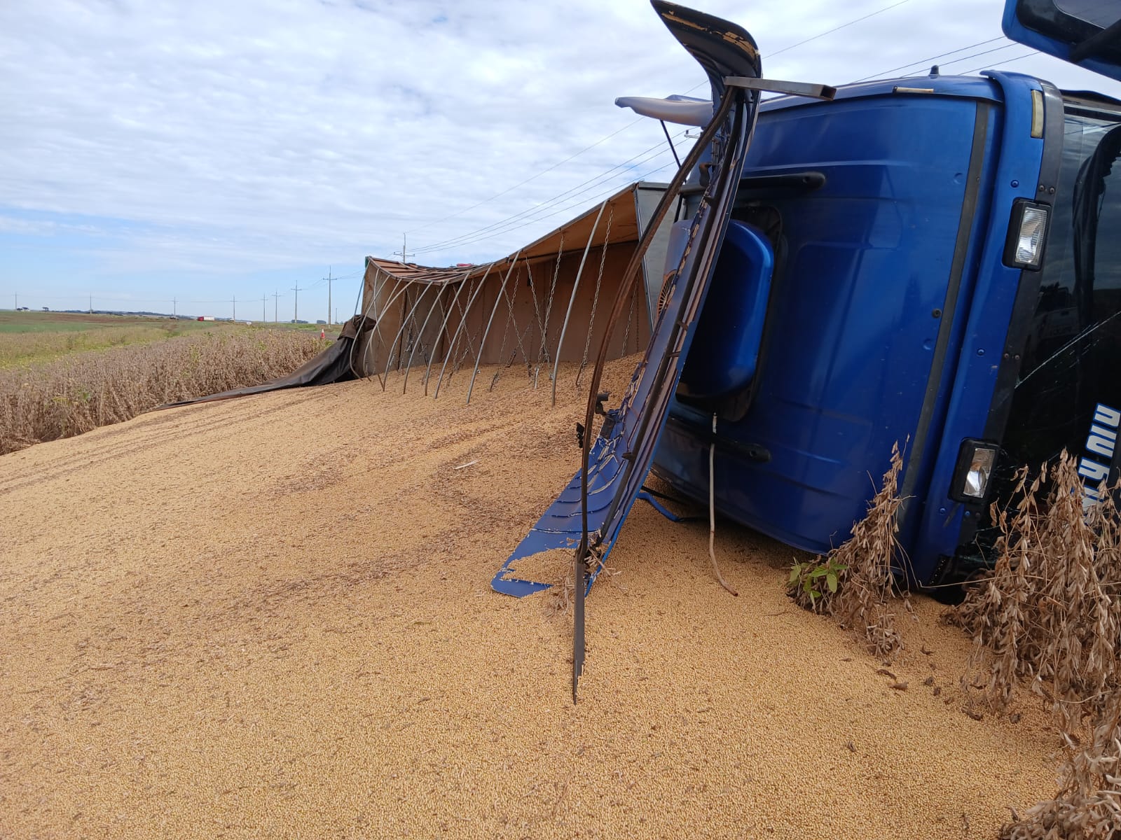VUELCO DE CAMIÓN CARGADO CON SOJA DEJA DAÑOS MATERIALES EN TOMÁS ROMERO PEREIRA