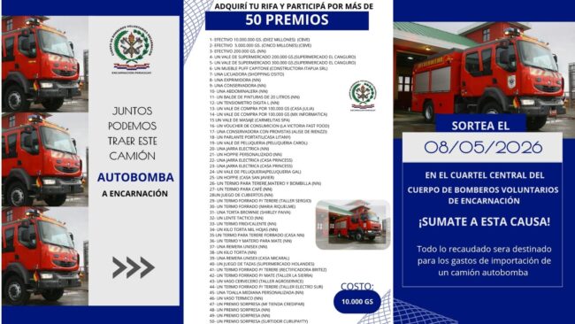 BOMBEROS DE ENCARNACIÓN LANZAN RIFA SOLIDARIA PARA ADQUIRIR CAMIÓN AUTOBOMBA