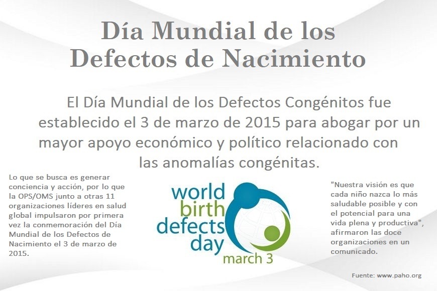 En el año 2015, se reconoció al 3 de marzo como Día Mundial de los Defectos al Nacer, por lo que desde el Ministerio de Salud se creó el Programa Nacional de Prevención de Defectos Congénitos. Al año siguiente, el 3 de marzo de 2016, se presentó el Plan del Programa Nacional, bajo el lema «En tus manos está prevenir, detectar y tratar los Defectos Congénitos». Ese año, se inició en varios hospitales del país un Registro Nacional de los Defectos Congénitos, a fin de identificar frecuencia y tipo de defectos congénitos, para luego ir implementando políticas de prevención y atención.