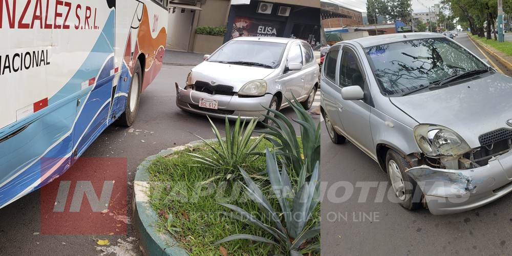 Hace instantes se registró un accidente de tránsito sobre la Avenida Bernardino Caballero acceso a la calle Antequera de Encarnación, donde un automóvil de la marca Toyota, modelo Vitz con Chapa N° BGL 612 al mando de Edgardo Rodríguez habría impactado con un ómnibus del servicio de transporte internacional, empresa Beato Roque González, guiado por Sergio Báez, cuando ambos se disponían a ingresar a la calle Antequera. Los involucrados en este accidente, tras el impacto fueron a parar sobre el paseo central y afortunadamente resultaron ilesos.