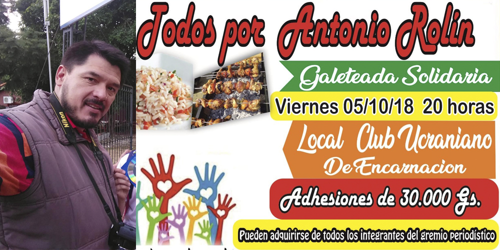 En el marco de campaña solidaria «Todos por Antonio Rolin», periodistas unidos de Itapúa organizan una Galeteada Solidaria para este viernes 05 de octubre desde las 20:00hs. en el Club Ucraniano de Encarnación, situado sobre la calle Gral. Artigas entre Constitución Nacional.