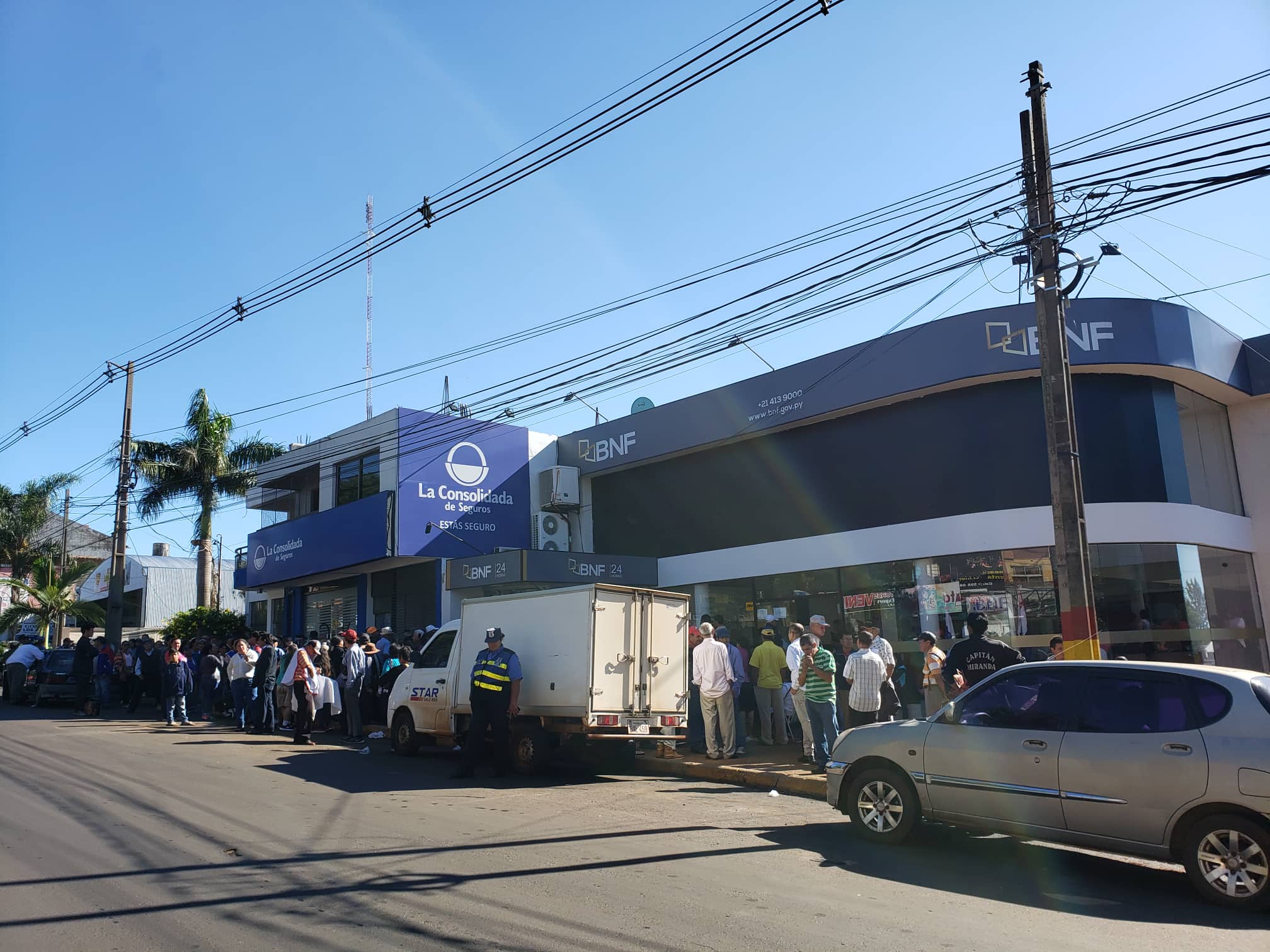 Integrantes de la Policía Nacional custodian el lugar y tratan de tranquilizar a las personas ansiosas de cobrar poco más de Gs. 500.000 que perciben mensualmente y esta vez de manera adelantada por las fiestas de fin de año.