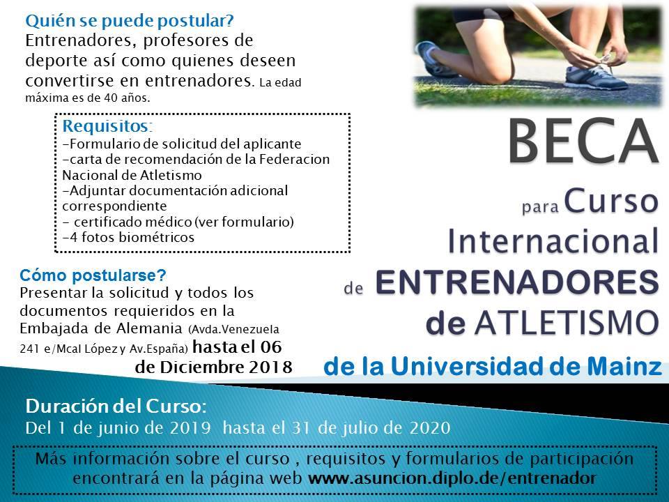 La Embajada de la República Federal de Alemania en Asunción, a través de la Secretaría Nacional de Deportes (SND), ofrece becas para el Curso Internacional de Entrenadores de Atletismo de la Universidad de Mainz – Alemania.