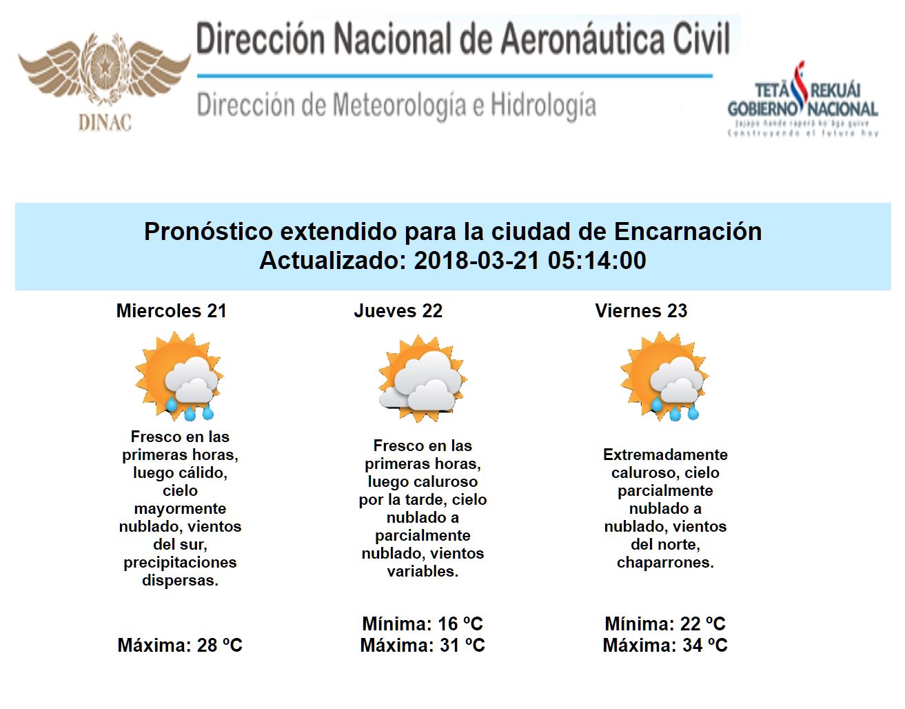 Hoy miércoles continuarían registrándose precipitaciones en forma dispersa sobre gran parte del país, acompañadas de eventuales tormentas sobre los departamentos del este y norte de la región Oriental y norte del Chaco. Durante el jueves, la mayor probabilidad de precipitaciones en forma de chaparrones y tormentas eléctricas aisladas se limitaría para el este y norte de ambas regiones. Para el viernes se prevén precipitaciones con las mismas características sobre todo el territorio nacional especialmente en horas de la tarde. Inicialmente los pronósticos indican una alta probabilidad de lluvias y tormentas eléctricas importantes sobre nuestro país a partir de la tarde del sábado.