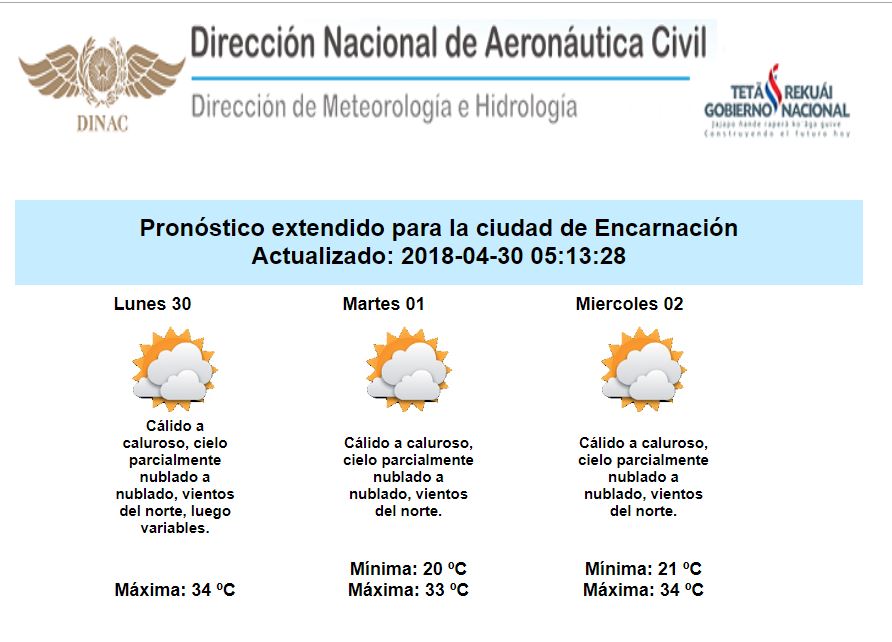 Los pronósticos continúan indicando que durante las próximas 72 a 96 hrs no tendríamos cambios significativos en cuanto a temperaturas; en consecuencia continuaríamos con días cálidos a calurosos a nivel país, donde las extremas oscilarían entre los 20 a 25 grados de mínimas y entre 32 a 37 grados de máximas, sobre ambas regiones. Además se prevé el predominio del viento norte y con un contenido de humedad no muy elevado.