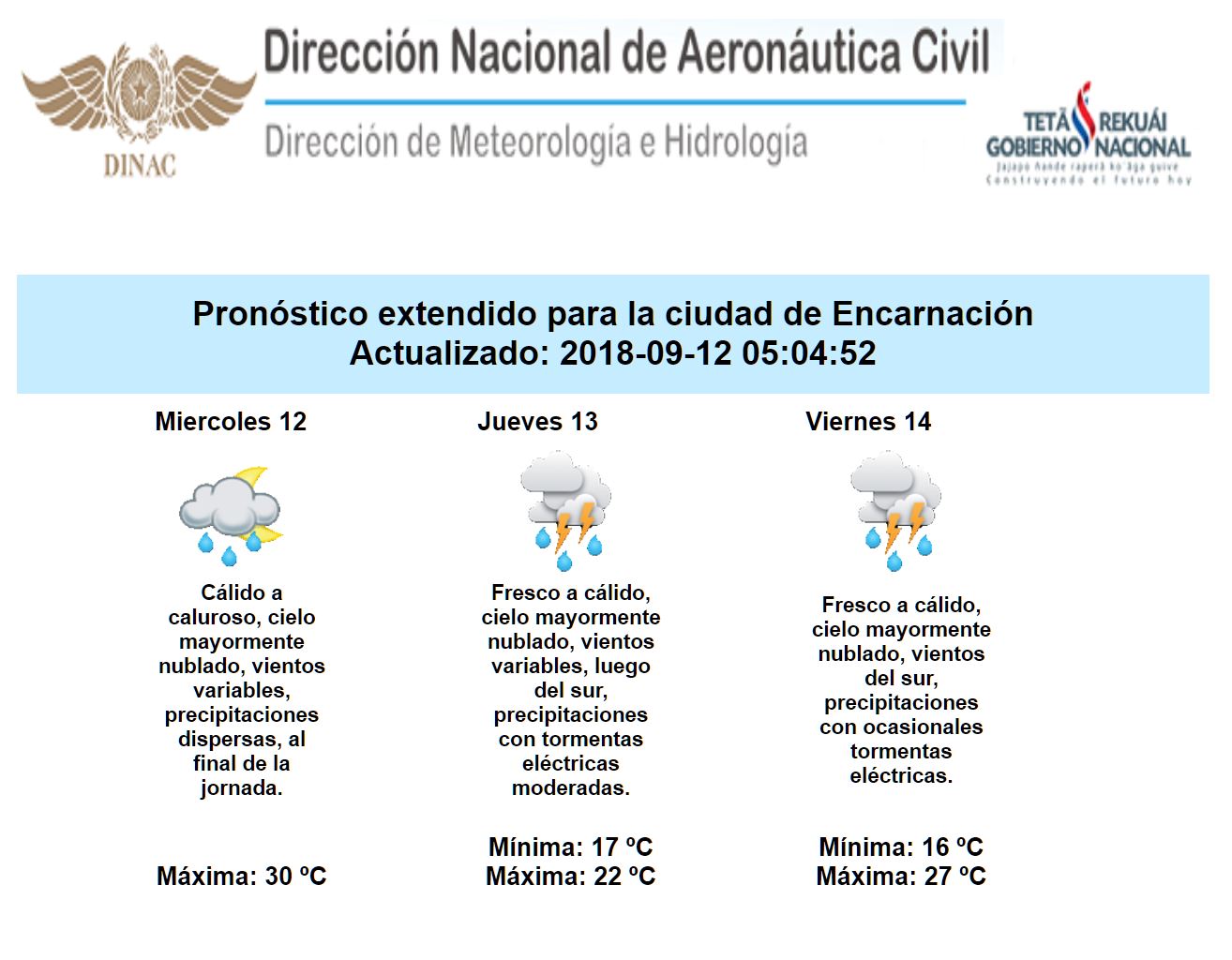 Los últimos análisis indican, que la probabilidad de lluvias dispersas aumenta hacia el final de la jornada del día de hoy miércoles, en localidades del centro y sur de la Región Oriental. Mañana jueves un sistema de tormentas organizado, afectaría ya a gran parte del país, inicialmente y con mayor intensidad a los departamentos del centro, sur y este de la Región Oriental y al Bajo Chaco, pudiéndose generar condiciones de tiempo severo en forma puntual. Las lluvias y tormentas eléctricas, posteriormente se trasladarían al resto del país. El ambiente inestable continuaría durante el fin de semana, pudiéndose presentar mejorías parciales durante el periodo de afectación. En cuanto a las marcas térmicas, esperamos condiciones predominantemente cálidas.
