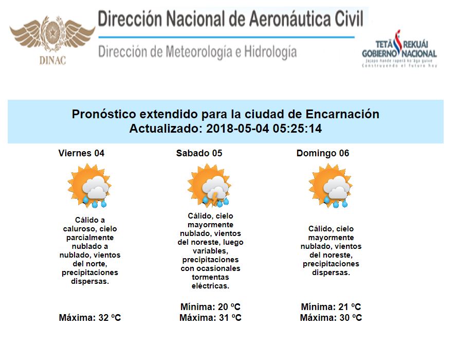 Para el día de hoy a partir de la tarde, esperamos un aumento de la nubosidad y luego lluvias que podrían ir acompañadas de tormentas eléctricas, para el Chaco y el sur del país. En el resto del país, podrían caer algunas precipitaciones dispersas. Mañana sábado, las precipitaciones y tormentas eléctricas podrían ser más generalizadas, con un sistema de tormentas más organizado, que ya en horas de la mañana podría ir afectando primeramente a localidades del sur del país y del centro-oeste del Chaco. Posteriormente afectaría al resto del Chaco y al centro y sur de la Región Oriental. El día de hoy, continúa el ambiente caluroso; en cambio mañana estaría predominantemente cálido por efecto de las lluvias, con descenso que se notaría sobre todo en las temperaturas máximas. Los vientos soplarían del norte y noreste.