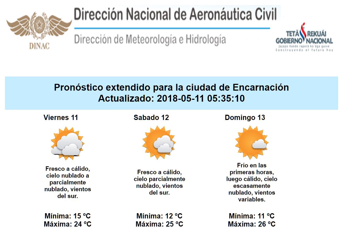Con el ingreso de un frente frío, se produjo el descenso de las temperaturas a nivel país. Durante la mañana de hoy, seguirían las lluvias y ocasionales tormentas eléctricas, en el norte de ambas regiones, mientras que en el resto del país podrían registrarse solo algunas lluvias dispersas en las primeras horas, luego mejorando durante la mañana. A la tarde, las condiciones ya mejorarían en todo el país, quedando la noche de hoy y el amanecer de mañana con marcas térmicas frescas. Mañana tendríamos predominio del sol en el país, con vientos del sur. Las datos parciales de lluvias registradas entre ayer y hoy en el país, dieron los siguientes valores: Asunción y Gran Asunción: 30 mm., Concepción: 34 mm., Casado: 31 mm., Santaní: 31 mm., Paraguarí. 22 mm., Pozo Colorado 17 mm., Capitán Meza: 15 mm., Gral. Bruguéz. 14 mm., Quyquyó: 14 mm., Caazapá:12 mm., Aeropuerto Guaraní: 10 mm., San Bernardino: 8 mm. y San Juan Bautista: 2 mm.. En la tarde de ayer, se reportaron ráfagas de vientos de: 76 km/h en Pilar; 74 km./h en el Aeropuerto Silvio Pettirossi y 72 Km./h en Encarnación.