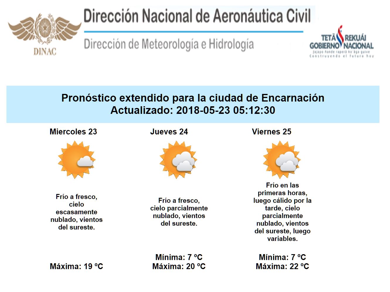 El ambiente predominante en el amanecer continuaría frío en todo el país con temperaturas mínimas de 07 y 09 °C para el sur centro y de 10 a 12 °C al norte de la región. Se prevé tardes con máximas que oscilarían entre los 20 a 26 °C, con un predominio de nubes altas.