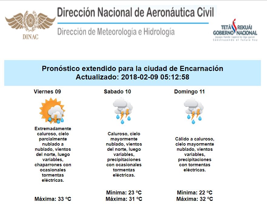 Durante la tarde de hoy viernes, podrían presentarse lluvias y ocasionales tormentas eléctricas en el extremo sur del país, como así también en el norte, noreste y este de la Región Oriental. El extremo noreste del Chaco, también se vería afectado por un sistema de tormentas. En las demás regiones del país, las lluvias serían en forma de chaparrones y ocasionales tormentas eléctricas. El ambiente reinante sería muy caluroso, con vientos de norte y luego de direcciones variables. Mañana sábado, las lluvias y tormentas eléctricas ya serían más generalizadas a nivel país, no descartándose la caída de importante cantidad de agua en corto periodo de tiempo en forma puntual, especialmente en el Chaco. Las lluvias y tormentas eléctricas continuarían el domingo, inclusive con un sistema de tormentas más organizado, precediendo a un débil frente frío, por lo que se esperan acumulados importantes de agua, siempre en forma puntual. Continuidad del ambiente caluroso, con un leve descenso de la temperatura hacia el domingo.
