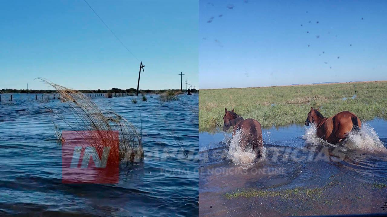 En ese trayecto de 3 km de campo y monte inundado se pueden observar: el terraplén de 2 metros completamente sumergido, las columnas de energía eléctrica y los postes de alambrados en la misma situación.