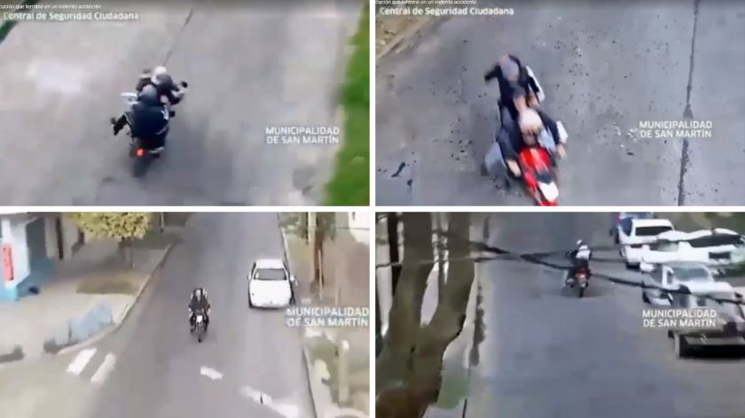 Las cámaras de seguridad ubicadas en el cruce de las calles Mar del Plata y Profesor Aguer, grabaron toda la persecución y revelaron el dramático desenlace. La Policía local salió al paso de los ladrones, luego de que a víctima haya llamado al 911, y la patrullera impactó contra el móvil de los asaltantes.