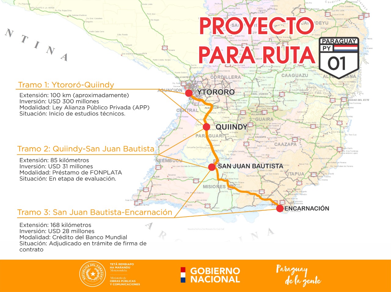La Ruta PY01 conecta Asunción con Encarnación y es una de las vías más importantes del Paraguay. Su puesta en valor se traduce en un beneficio directo para Quiindy, Caapucú, Villa Florida, San Miguel, San Juan Bautista y Encarnación. Como se trata de un ruta estratégica, su recuperación tendrá un efecto en la economía del país.