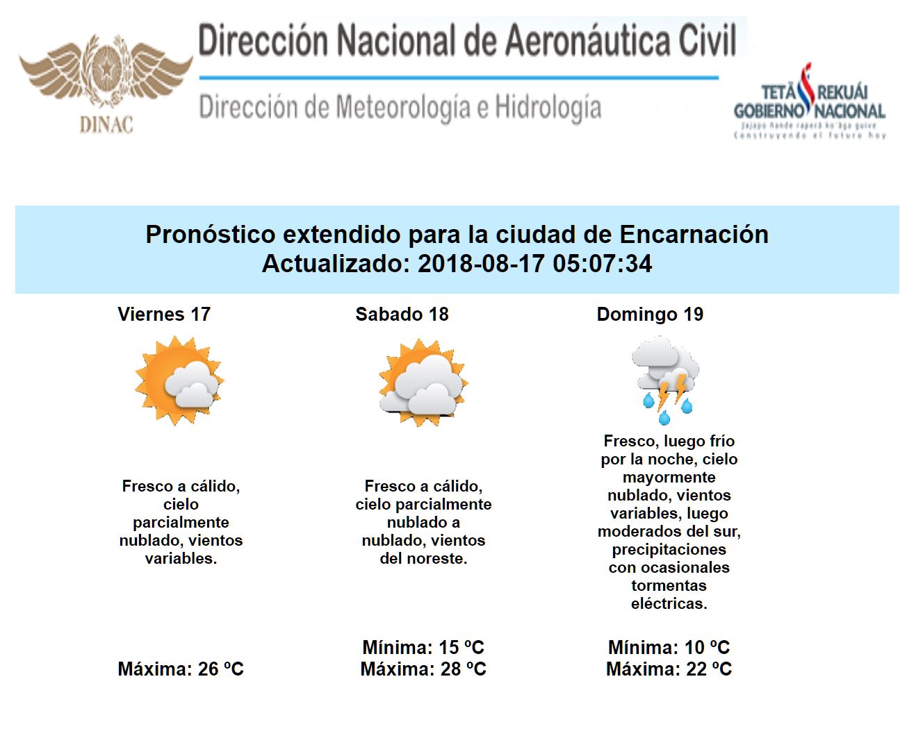 En cuanto a las precipitaciones, para el día de hoy y mañana es muy baja la probabilidad, sin embargo, el día domingo, se esperan lluvias y tormentas eléctricas generalizadas que iniciarían ya desde la madrugada en el sur de la región Oriental y el Chaco, para luego en el transcurso del día abarcar a más territorio; posterior a esto, las temperaturas descenderán nuevamente.