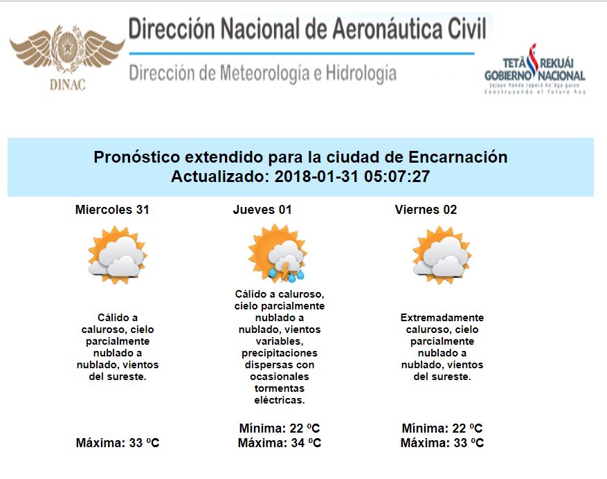 Los pronósticos continúan indicando que sobre nuestro país seguira predominando una masa de aire calurosa y húmeda durante los próximos días, las elevadas temperaturas asociadas con el contenido de humedad favorecerían a un ambiente extremadamente caluroso, en consecuencia se espera un alto grado de incomodidad.