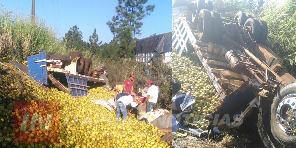 Efectivos policiales informaron que el camión con capacidad de unos 12 mil kilos transportaba cítricos hacia la fábrica Trociuk, cuando perdió el control del rodado y terminó volcando. Redacción: A.S.