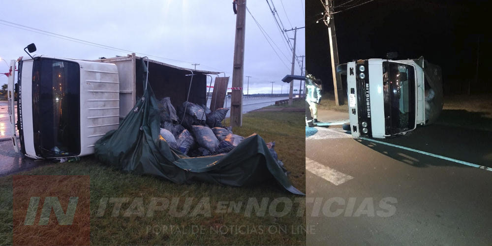 Un camión transportador de carbón transitaba sobre la Ruta 1 con dirección a Encarnación cuando a la altura del km 328 en pleno centro de Carmen del Paraná el conductor identificado como Catalino Palacio perdió completamente el control del rodado y terminó volcando, el mismo iba acompañado por Pablo Javier Acosta.