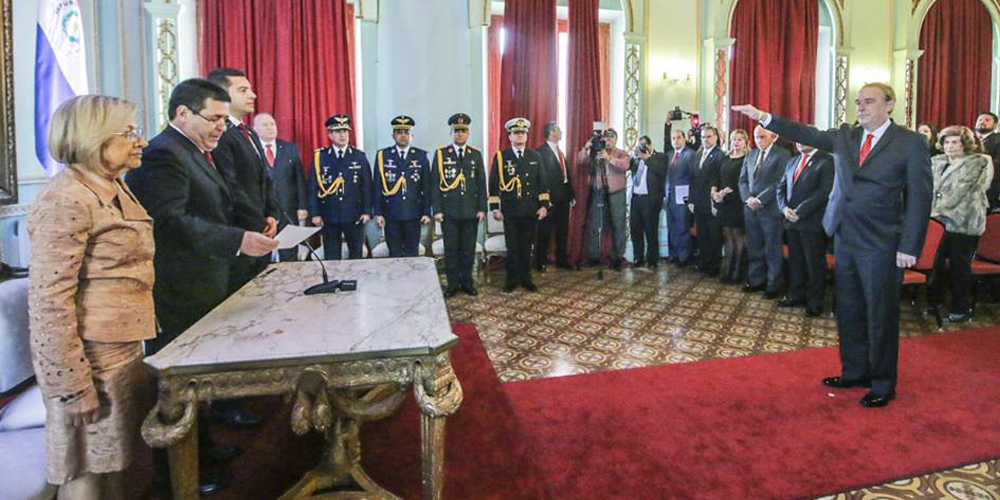 El Salón Independencia del Palacio de López fue escenario hoy de la ceremonia de juramento del nuevo ministro de Agricultura y Ganadería, Dr. Luis Roberto Gneiting. El acto fue presidido por el jefe de Estado, Don Horacio Cartes. Asistieron a esta cita altas autoridades del Gobierno Nacional, entre ellos ministros del gabinete presidencial, altos mandos de las fuerzas militares y policiales, además de invitados especiales.