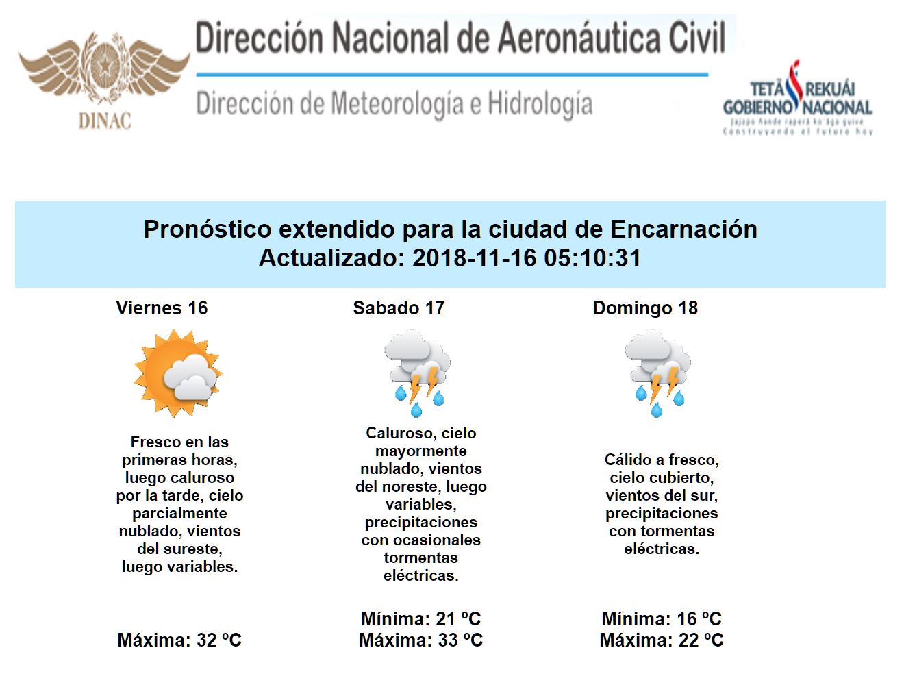 Buen tiempo con cielo parcialmente nublado y tarde calurosa para gran parte de la Región Oriental, a excepción del norte y este, donde podrían registrarse chaparrones y ocasionales tormentas eléctricas en horas de la tarde; como así también en gran parte del Chaco, también durante la hora de mayor calentamiento de la tarde, periodo en el que el ambiente se torna más inestable. Mañana sábado, un sistema de tormentas ya estaría afectando al extremo sur del país con mayor intensidad; en tanto que para el resto de nuestro territorio hay probabilidad de lluvias dispersas y ocasionales tormentas eléctricas. En la madrugada del domingo, con el ingreso de un frente frío, las lluvias y tormentas ya serían más intensas a nivel país y los vientos irían rotando al sur, con un leve descenso de la temperatura.