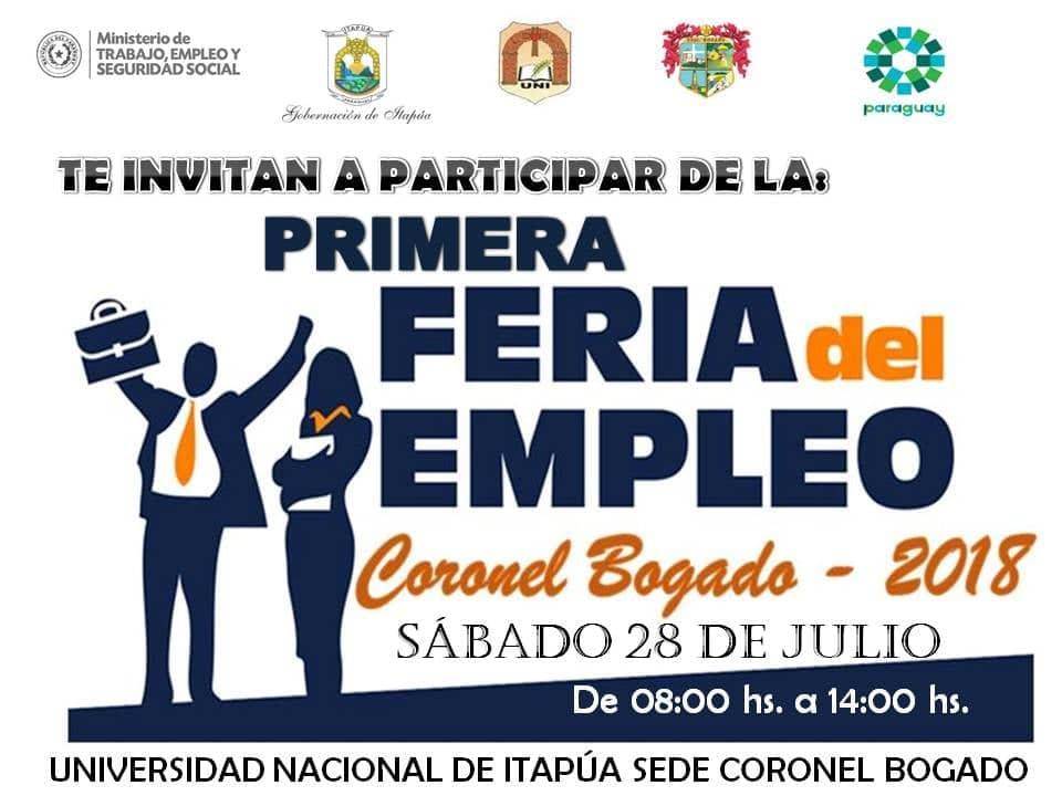 El sábado 28 de Julio del corriente se estará realizando la Primera Feria de Empleo en Coronel Bogado a partir de las 8:00 hs. en la sede de la Universidad Nacional de Itapúa.