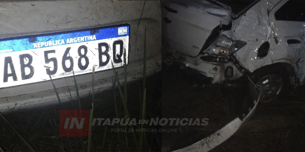 Un accidente de tránsito se produjo hace instantes sobre la Ruta 1 a la altura de la Compañía Curuñai del distrito de Coronel Bogado que involucró a un automóvil Chevrolet al mando de Rubén Alfredo Sansevich de nacionalidad argentina, quien estaba acompañado de una mujer mayor de edad.