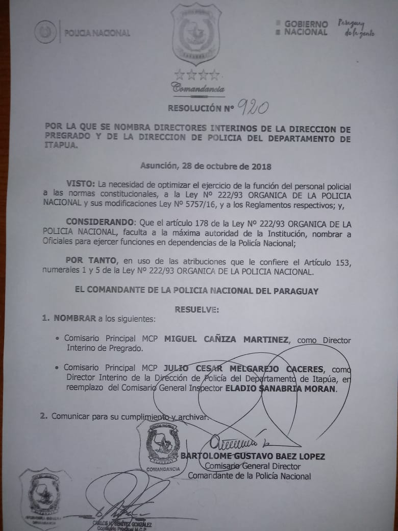 El Comandante de la Policía Nacional Crio. Gral. Director Bartolomé Gustavo Báez ordenó a través de la Resolución 920/18 nombrar al Crio. Ppal. Julio César Melgarejo como Director Interino de la Policía Nacional del Departamento de Itapúa en reemplazo del Crio. Gral. Eladio Sanabria Morán quien pasa a cumplir funciones como Director General Interino de Justicia Policial en reemplazo del Crio. Gral. Inspector William Giménez Barboza quien queda a disposición de la Comandancia.