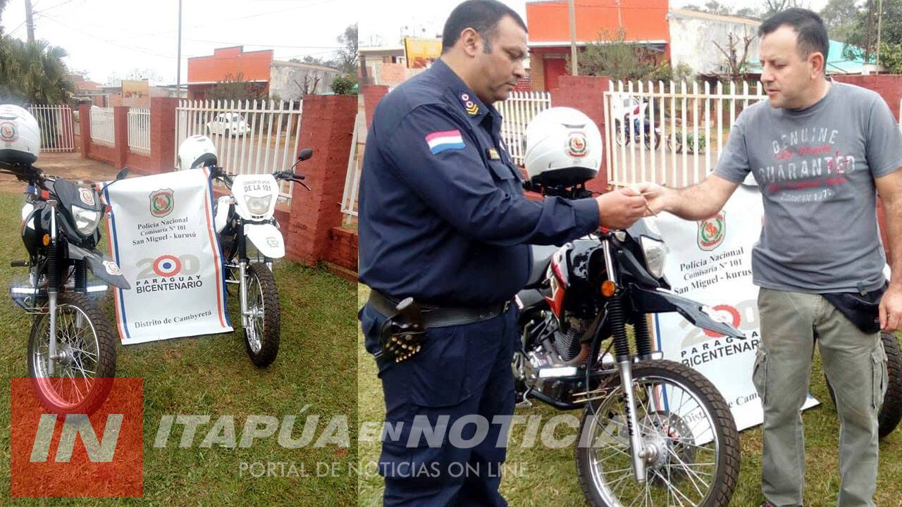 Integrantes de la Comisión de Apoyo de la Comisaría 101 de San Miguel Curuzú, ubicada sobre la Ruta 14 en el distrito de Cambyretá, han dotado de una motopatrulla totalmente reparada a efectivos de la Policía Nacional. Con la entrega suman dos las motocicletas donadas por integrantes de la Comisión a esta Comisaría.
