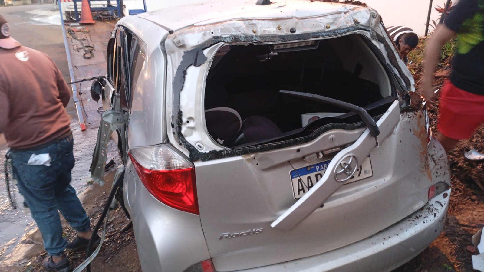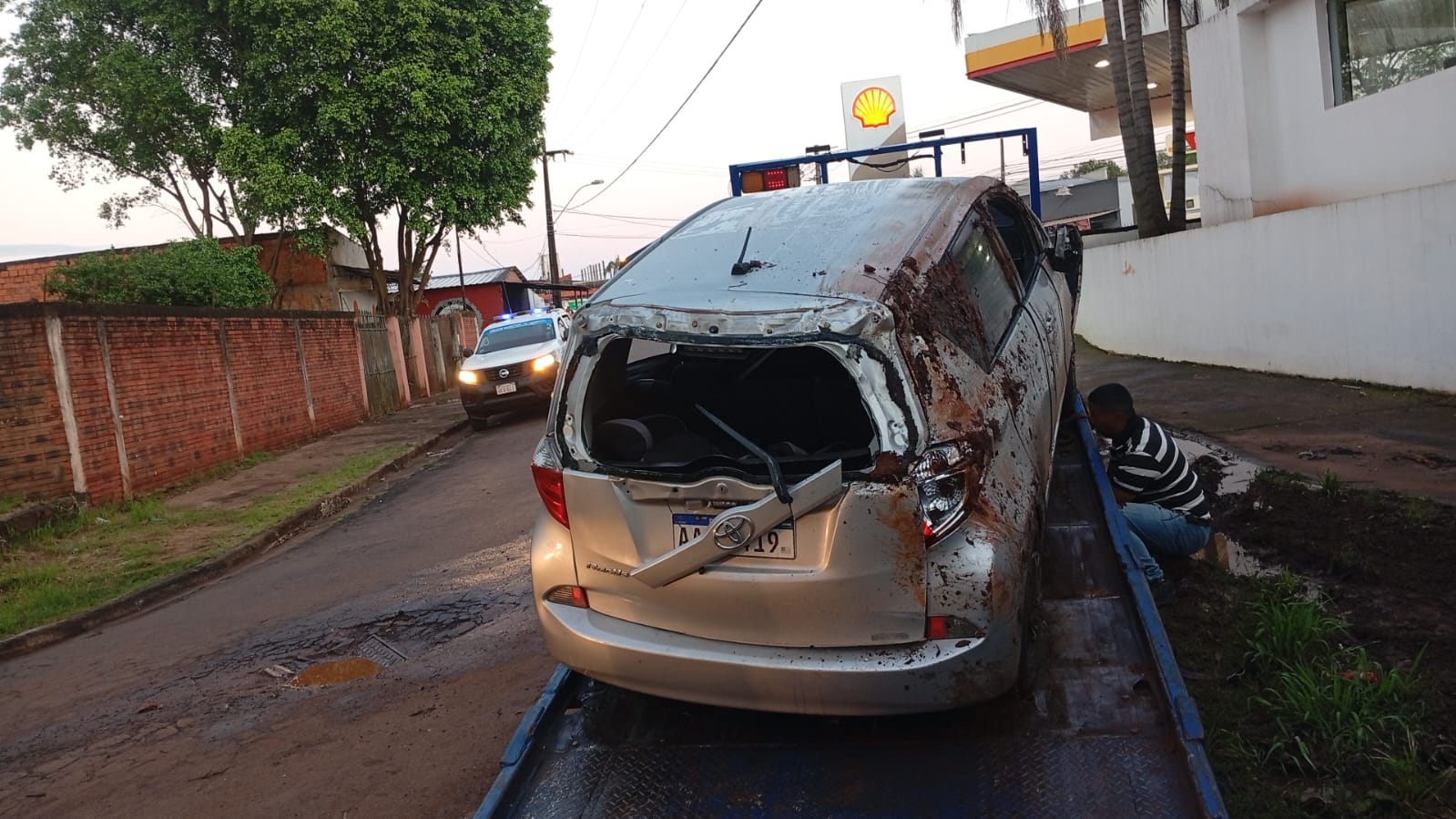 El vehículo siniestrado, un Toyota modelo Ractis con matrícula AAPL419, quedó prácticamente destrozado. Según reportes preliminares, una de las puertas estuvo a punto de desprenderse por completo a raíz del fuerte impacto.