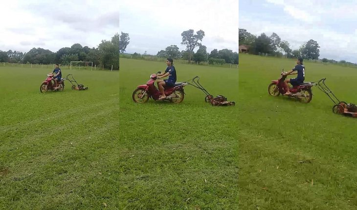 El joven se desplaza sobre una motocicleta y detrás lleva remolcando una cortadora de césped, que va realizando su trabajo, a gran velocidad.