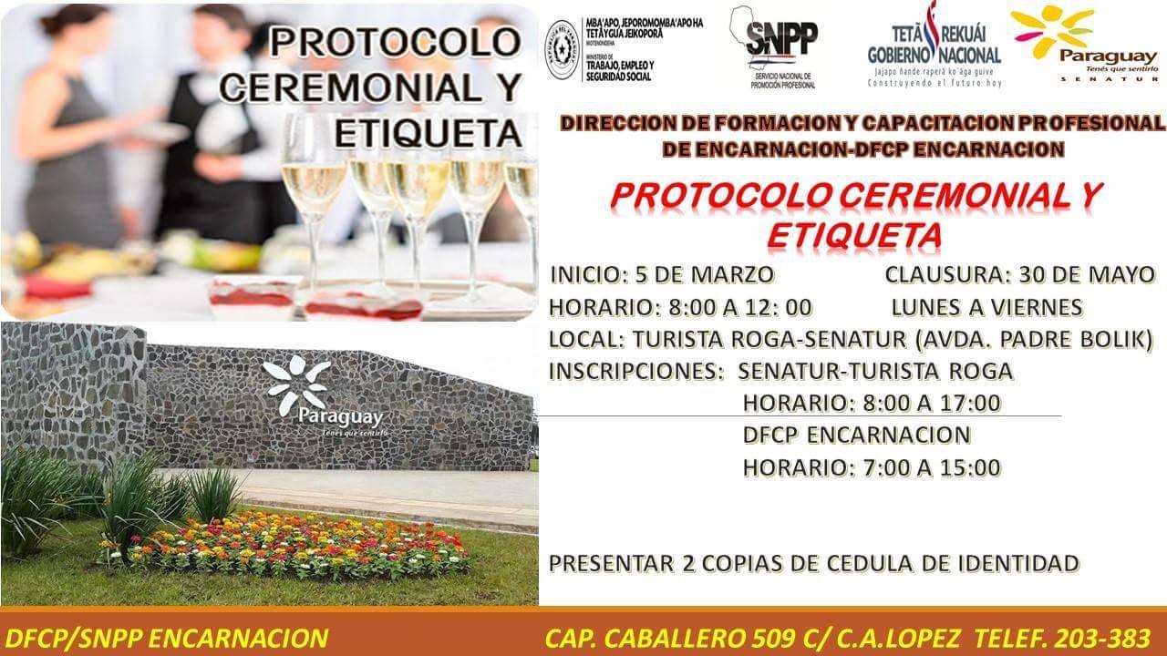 La Dirección de Formación y Capacitación Profesional de Encarnación, dependiente del SNPP llevará adelante el Curso de Protocolo, Ceremonial y Etiqueta en el local de Turista Róga a partir del próximo 5 de marzo.