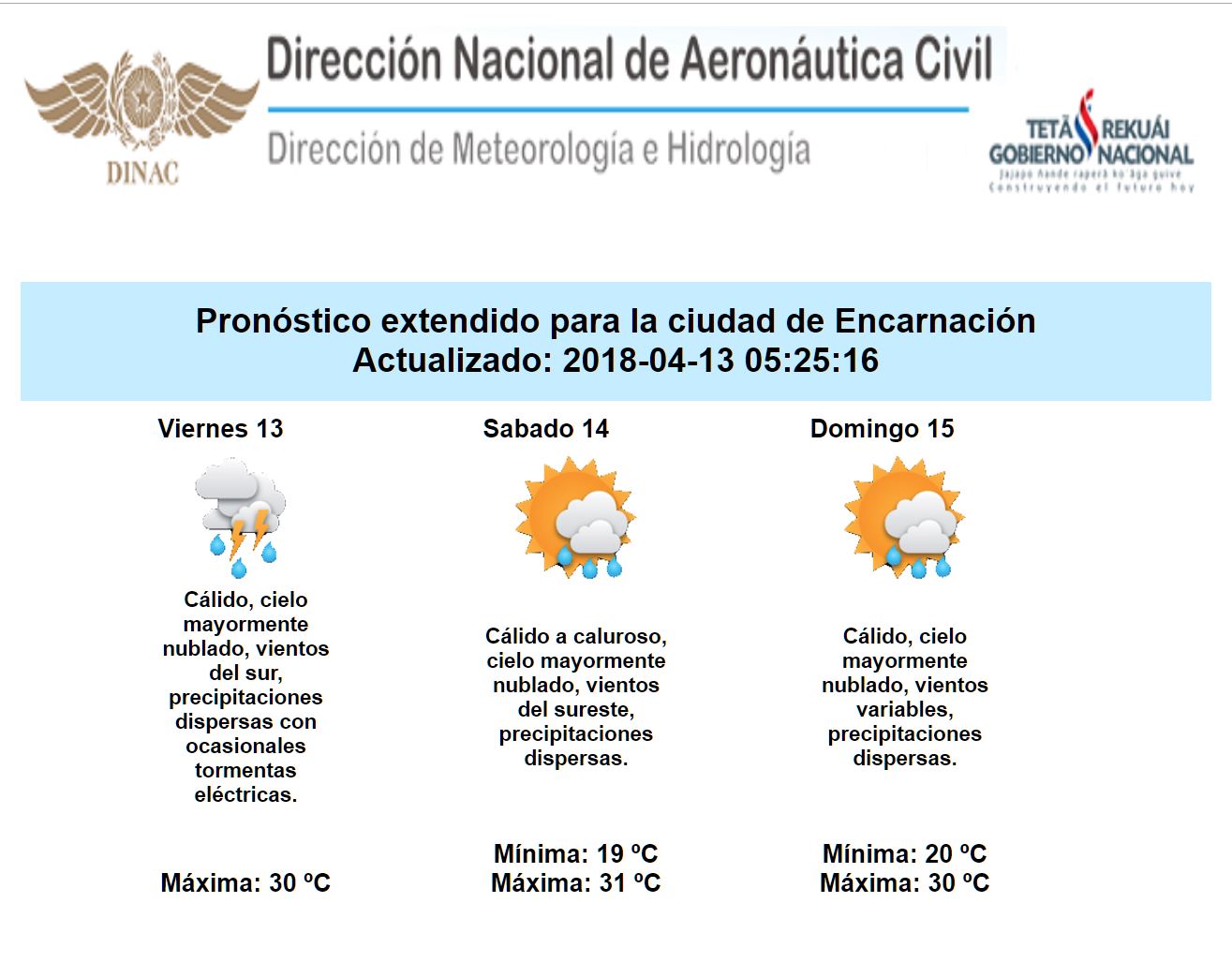 Hacia mañana sábado las precipitaciones estrían dominado al sur y este de la región en forma desorganizada, lo que mantiene al resto del país con baja posibilidad de lluvias. El domingo se prevén lluvias con características de chaparones dispersos que en gran parte del paísy podrían presentarse con ocasionales tormentas eléctricas en algunos puntos.