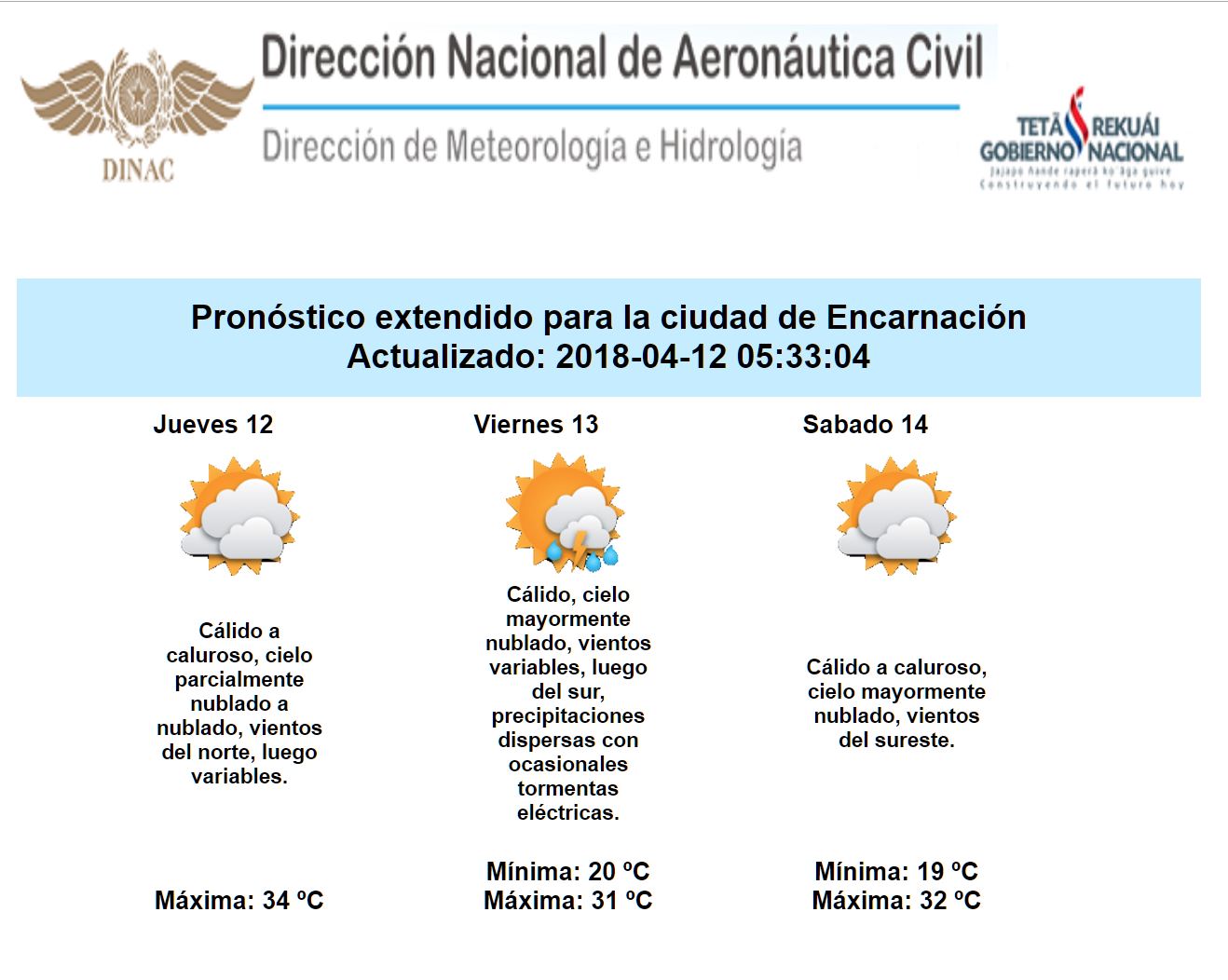 La jornada de hoy, se presentará con un ambiente caluroso, el cielo con intervalos de sol y nubes y vientos predominantes del norte, por lo tanto muy baja probabilidad de lluvias a nivel país. El día de mañana, habría un aumento de nubosidad y podrían registrarse lluvias dispersas en el Chaco, como así también en el Centro y Sur de la Región Oriental. En el extremo noroeste del Chaco, como así también en algunas localidades del sur de la Región Oriental, las lluvias irían acompañadas de ocasionales tormentas eléctricas. Posteriormente, se produciría un leve descenso en las temperaturas, con el giro de los vientos al sur, debido al ingreso de un débil frente frío.