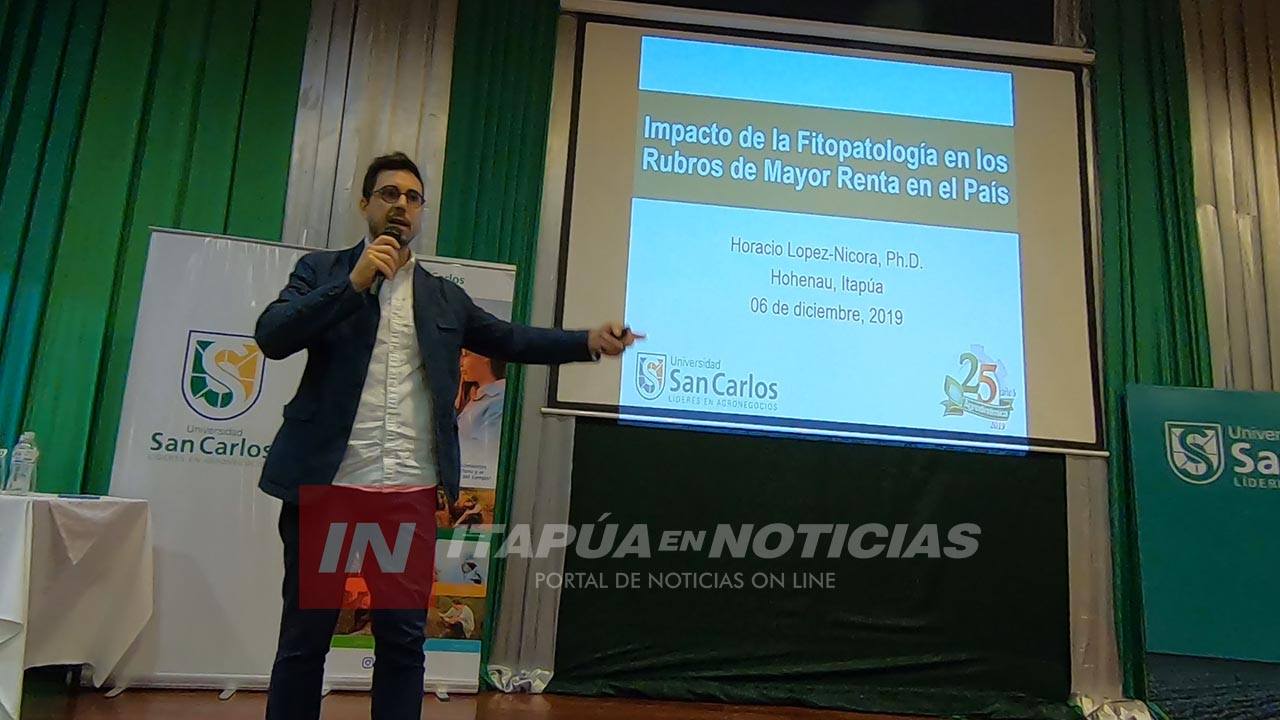 En el salón auditorio de la Agrodinámica, el Dr. Horacio López Nicora, vice director de investigación de la universidad San Carlos dictó la conferencia “Impacto de las fitopatologías en los cultivos de renta del Paraguay”.