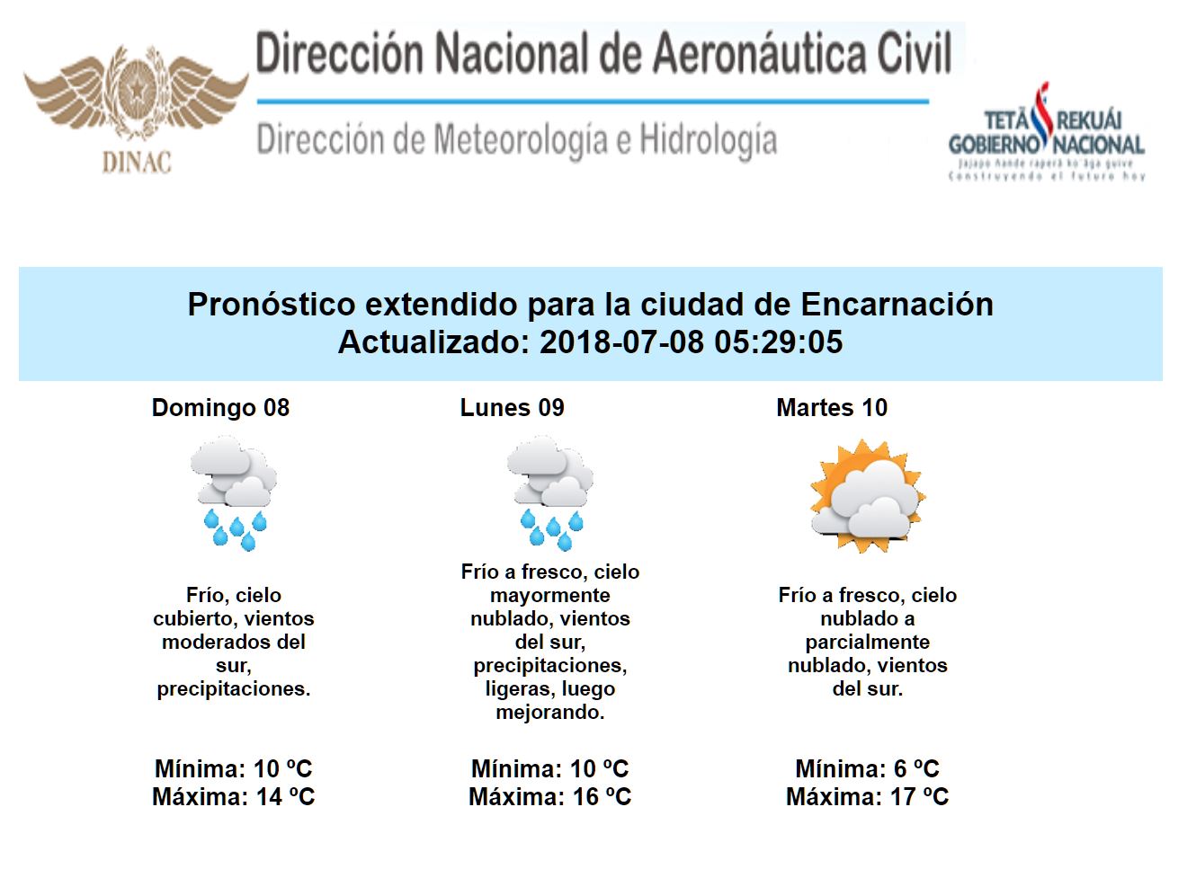 La jornada de hoy domingo se presentaría con precipitaciones de variada intensidad en todo el territorio nacional. Dicha condición de inestabilidad se extendería hasta el día lunes, con tendencia a ir mejorando paulatinamente. Desde el martes sin precipitaciones a nivel país.