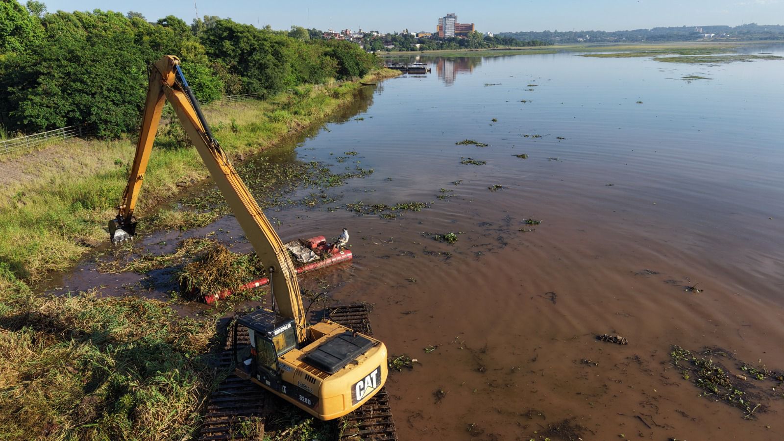 Por instrucciones del Director de la EBY, Lic. Luis Benítez, se utilizó maquinaria anfibia especializada para realizar una limpieza integral del cuerpo de agua, removiendo tanto las malezas acuáticas como los desechos sólidos acumulados.
