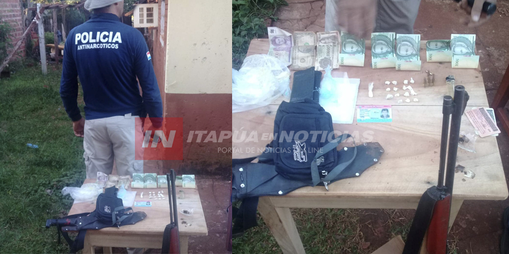 Entre ellas 15 tocos que totalizan 4,9 gramos de supuesta cocaína, tipo Crack, un toco de supuesta Cocaína, además de ello un rifle calibre 22 con diez proyectiles sin percutir, la suma de Gs. 512.500 y un billete de un Dólar Americano.