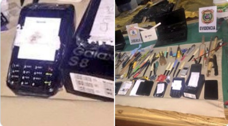 Además de este objeto, los intervinientes se incautaron de celulares, router, computadoras, tarjetas de memoria, más de 100 armas blancas y cuatro paquetes de cocaína.