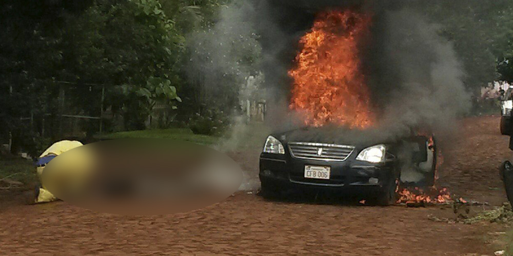 En una de las imágenes que llegaron desde el lugar de los hechos se observa a un agente de la Policía constatando si uno de los delincuentes tenía aún signos de vida. El vehículo en el que se desplazaban, un Toyota tipo Premio de color negro, se incendió.//HOY