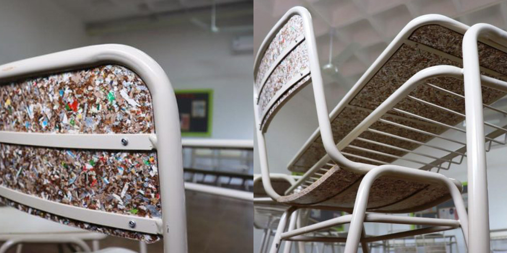 Lo novedoso de la donación es que el mobiliario está fabricado con tableros hechos con envases de cartón post consumo, de la reconocida marca de envases para alimentos, resultado de un proceso de reciclaje donde se reaprovechan los materiales.