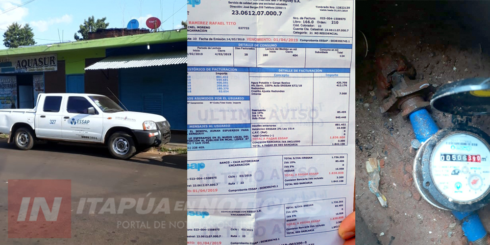 El señor Tito Ramírez vecino del barrio Poti’y de Encarnación, denunció ayer ante nuestro medio una supuesta sobrefacturación en el servicio de agua potable. El mismo reclamó a la ESSAP que la factura de este mes indica que debe pagar más de Gs. 1.500.000 siendo que generalmente abona un promedio de Gs. 300.000. Agregó que reclamó esta situación ante la ESSAP pero que no le dieron ninguna respuesta favorable ni le insinuaron que iban a arreglar el problema.