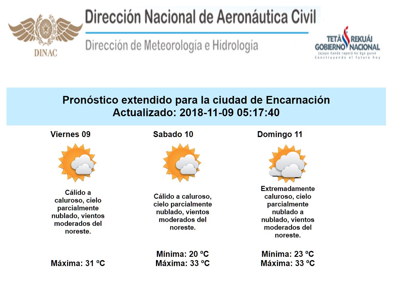Desde la jornada de hoy viernes 09, el ambiente se presentaría extremadamente caluroso en gran parte del país, esto sumado al alto contenido de humedad, mantendría elevado la sensación de incomodidad en especial en horas de la tarde, cabe destacar que esta condición se extendería durante todo el fin de semana e inicios de la semana que viene, con ascenso progresivo de las temperaturas a partir de la jornada de hoy, condición que se detalla en el boletín adjunto.