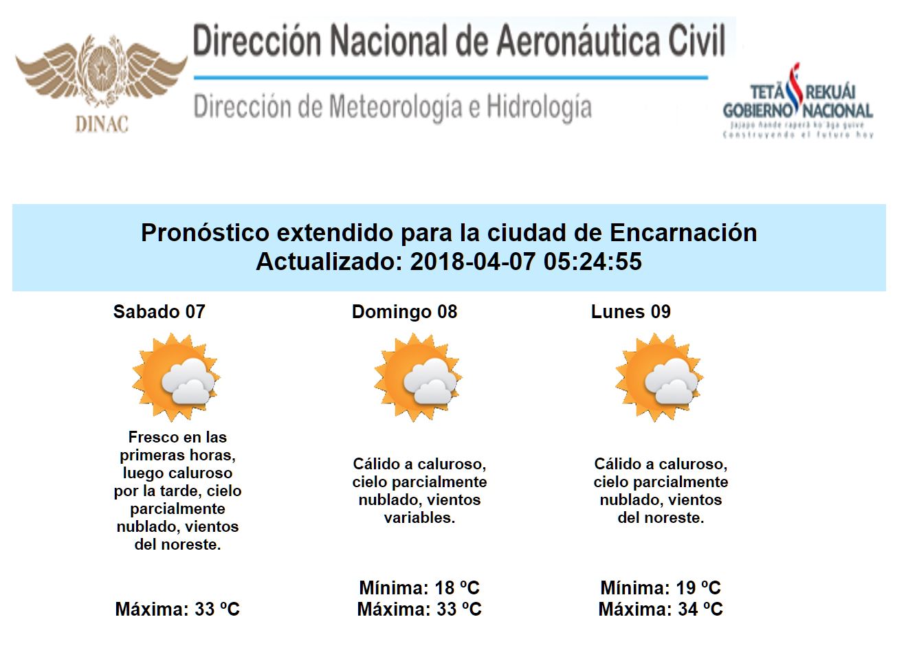 En cuanto al ambiente, nos esperan noches y amaneceres agradables, mientras que las tardes serian cálidas a calurosas durante el fin de semana; ya a inicios de la semana venidera se tornaría incluso extremadamente caluroso en algunos puntos del país. Las extremas previstas oscilarían entre 18 y 23 °C de mínimas, mientras que las máximas rondarían valores de entre 31 y 36 °C sobre la región Oriental y con valores superiores sobre en el Chaco.