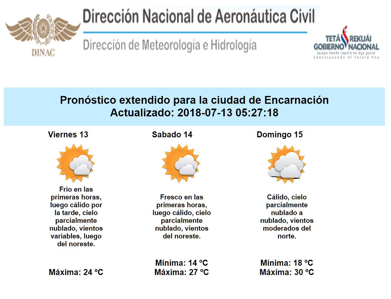 La jornada de hoy en el transcurso de la mañana se presenta con ambiente frío en los departamentos del sur del país y fresco el resto del territorio, los vientos irán al sector noreste a partir de la tarde, por lo tanto a partir de ese período las temperaturas se tornarían cálidas; se espera precipitaciones ligeras y dispersas en el norte del país, las cuales se limitan solamente a las primeras horas del día.