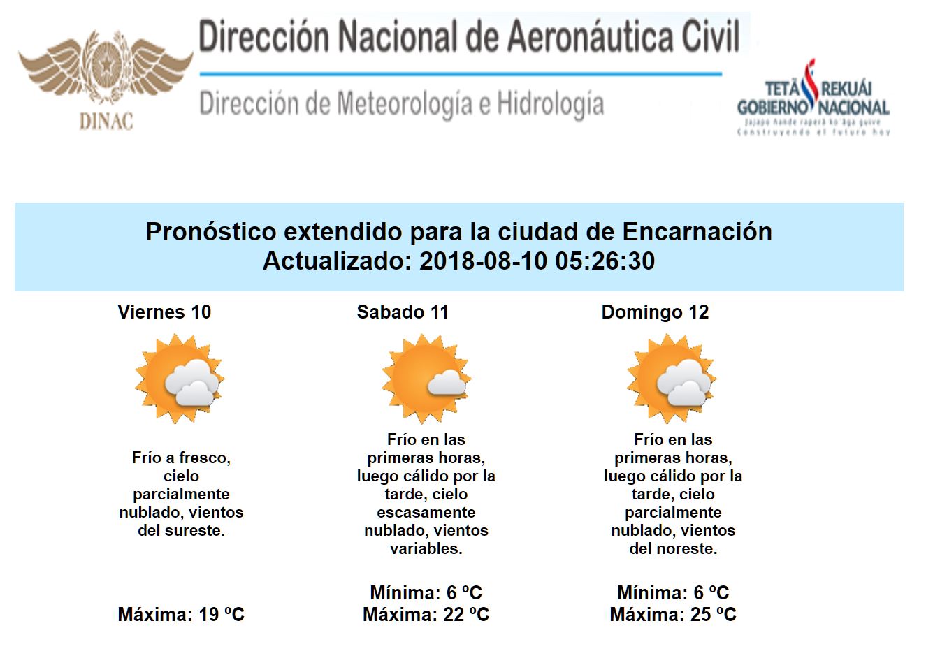 El amanecer de esta viernes se presenta frío sobre nuestro país, estas condiciones persistirán durante el fin de semana, es decir, el ambiente continuaría presentándose frío en las noches y los amaneceres con temperaturas mínimas que rodarían entre 3 y 7°C para el sábado, no descartando la formación de escarchas sobre el centro, sur y oeste del Chaco y algunos puntos de la región Oriental, en tanto que para el domingo oscilarían entre 6 y 10°C; mientras que en horas de mayor incidencia de la radiación solar las mismas superarían los 23 a 24 °C, incluso rondando los 30 °C hacia el domingo.