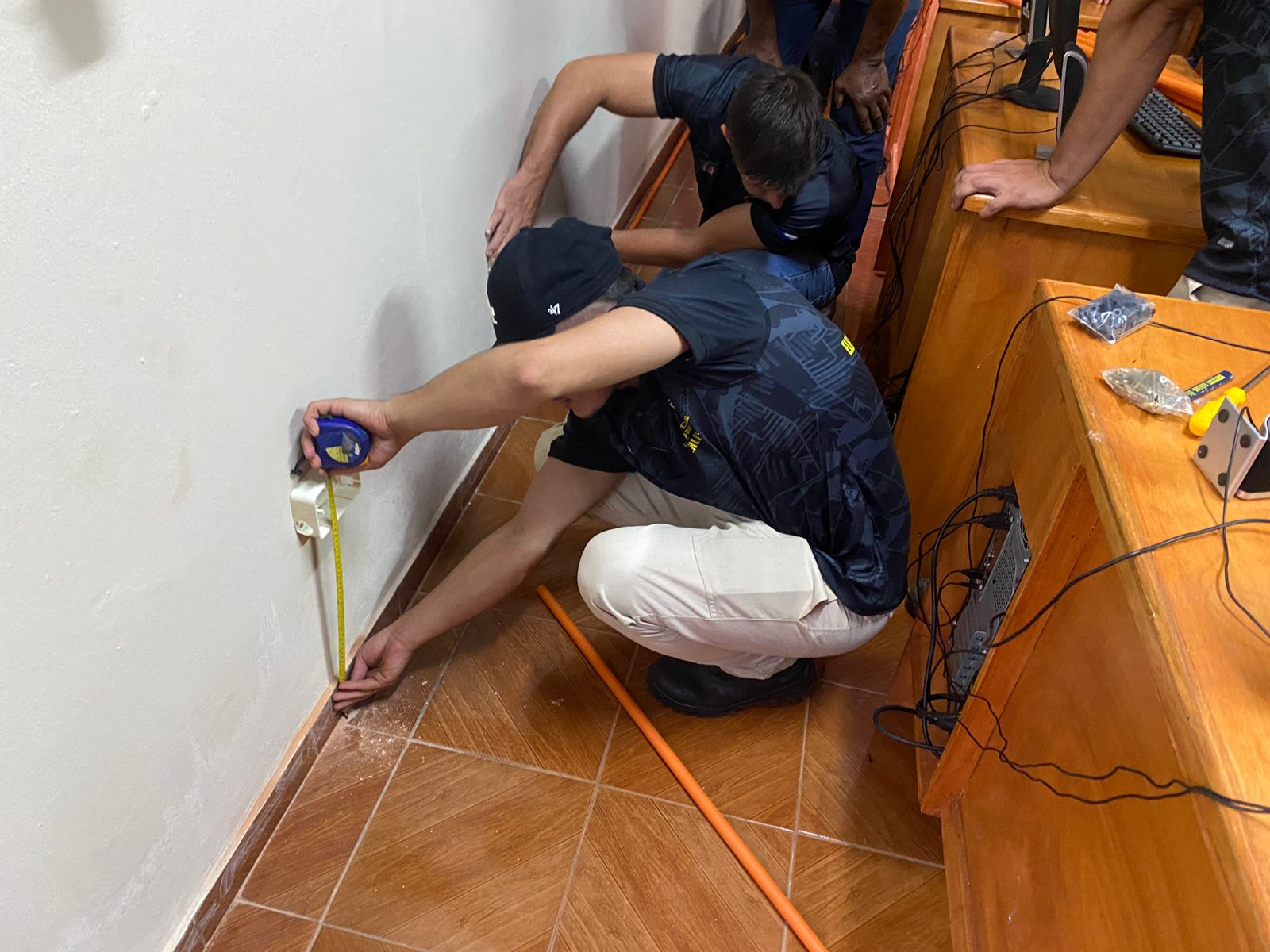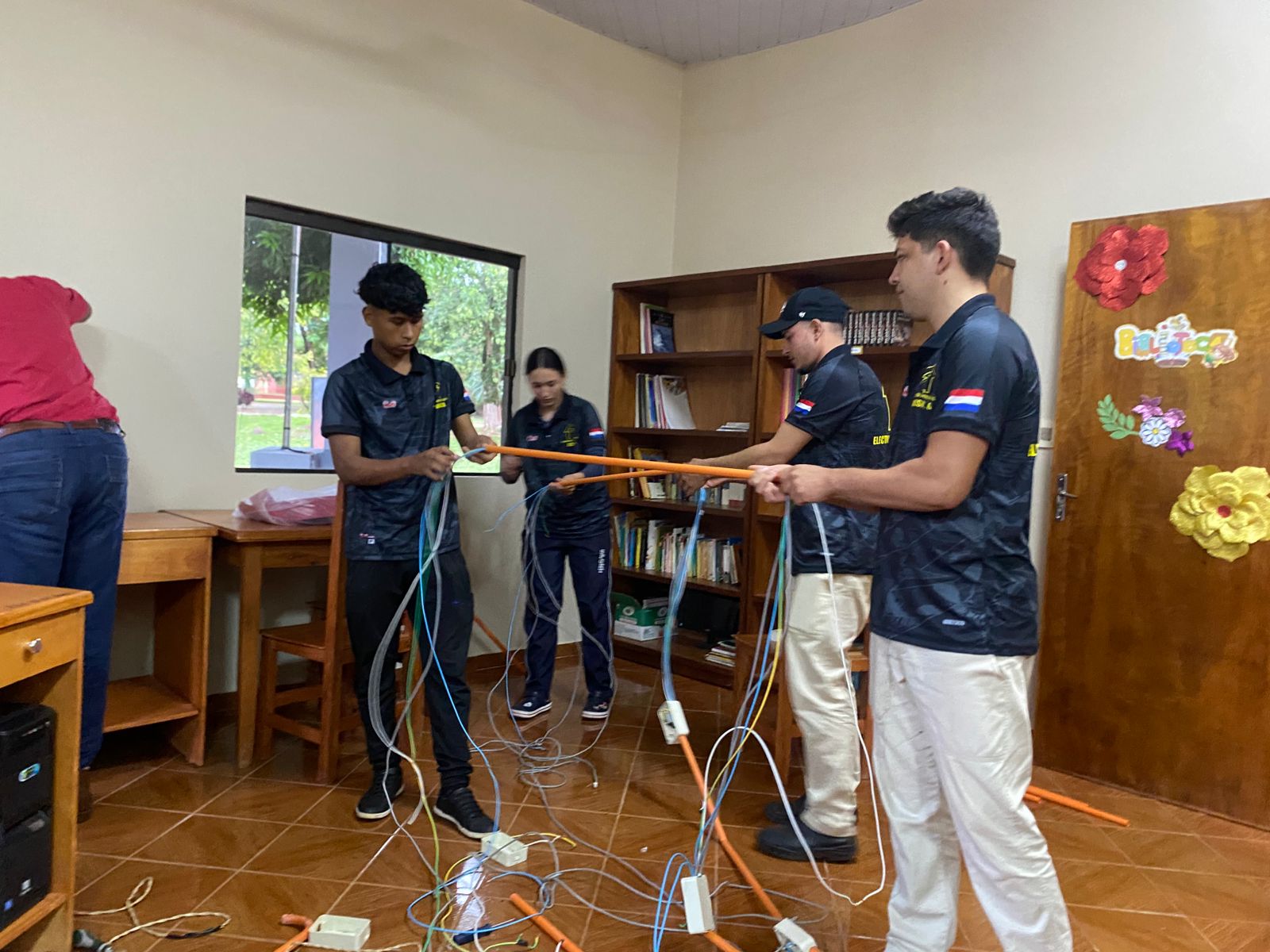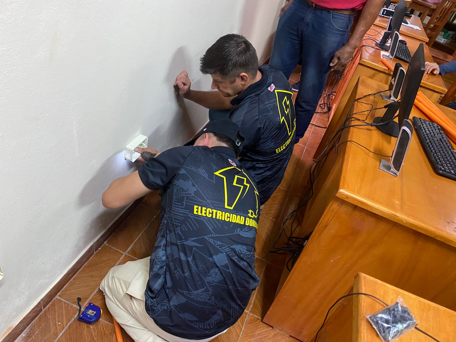 Estudiantes del curso de Electricidad Domiciliaria impulsado por la Municipalidad de La Paz llevan adelante trabajos prácticos en la biblioteca local, donde realizan la instalación de tomacorrientes destinados al funcionamiento de equipos informáticos.