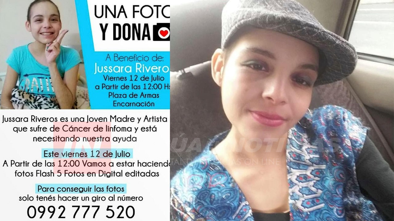 Jussuara Riveros es una joven madre que sufre de cáncer de linfoma, la misma es artista pero su estado de salud le impide seguir trabajando. Ante esta situación, fotógrafos solidarios de Itapúa se organizaron para ayudarla de alguna manera desde Encarnación.
