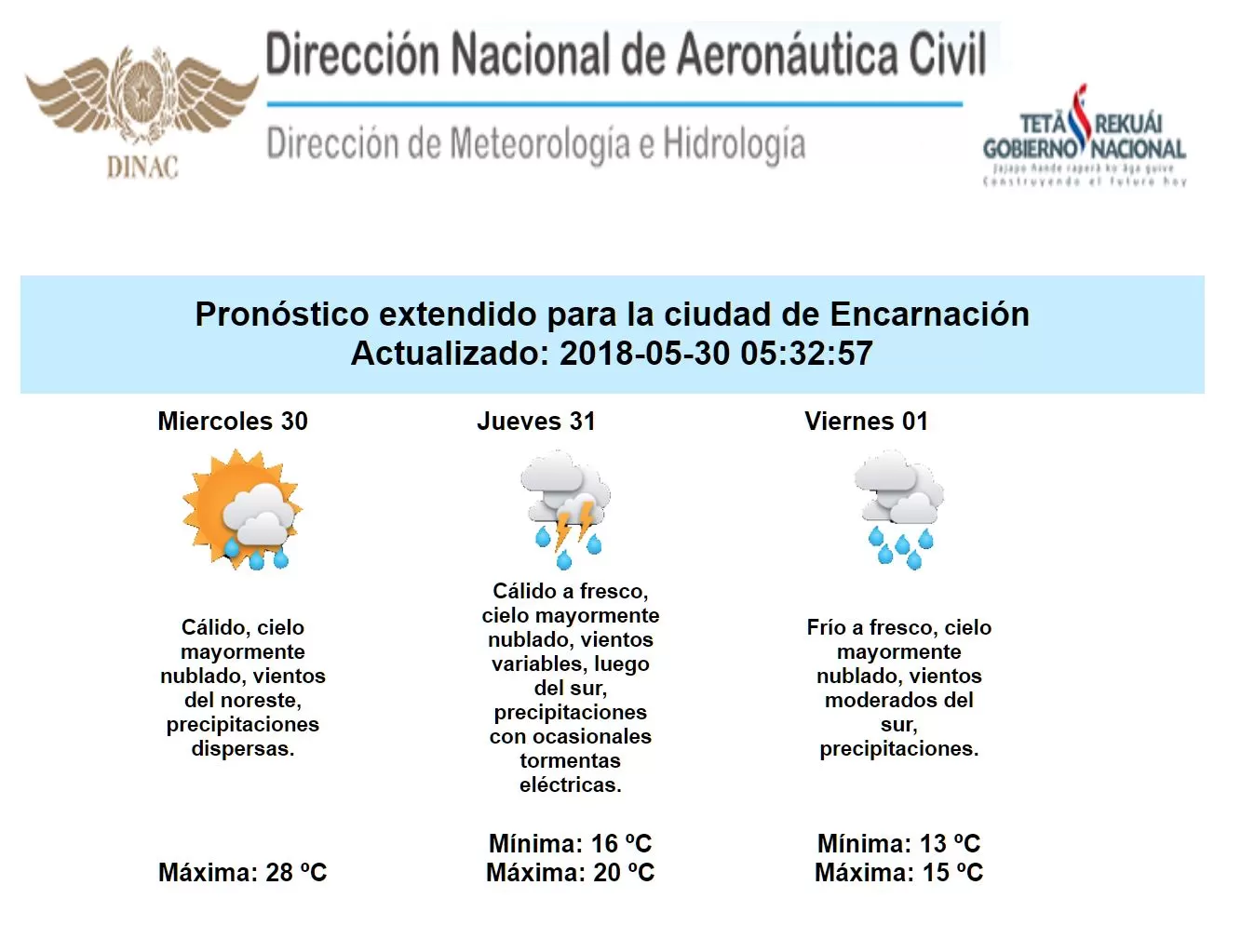 El jueves, durante la madrugada y el amanecer se estaría organizando núcleos de tormentas, que en principio afectarían al sur de ambas regiones, para luego avanzar y afectar al resto del país; las cuales podrían ocasionar fenómenos de tiempo severo. Hacia el vienes igualmente persistirían las precipitaciones, las más significativas al noreste de la región.