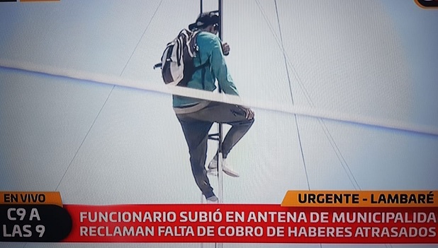 Un joven funcionario de la Municipalidad de Lambaré trepó a la antena de la comuna en la mañana de este viernes. Los empleados no cobran sus salarios hace meses y están en vigilia.