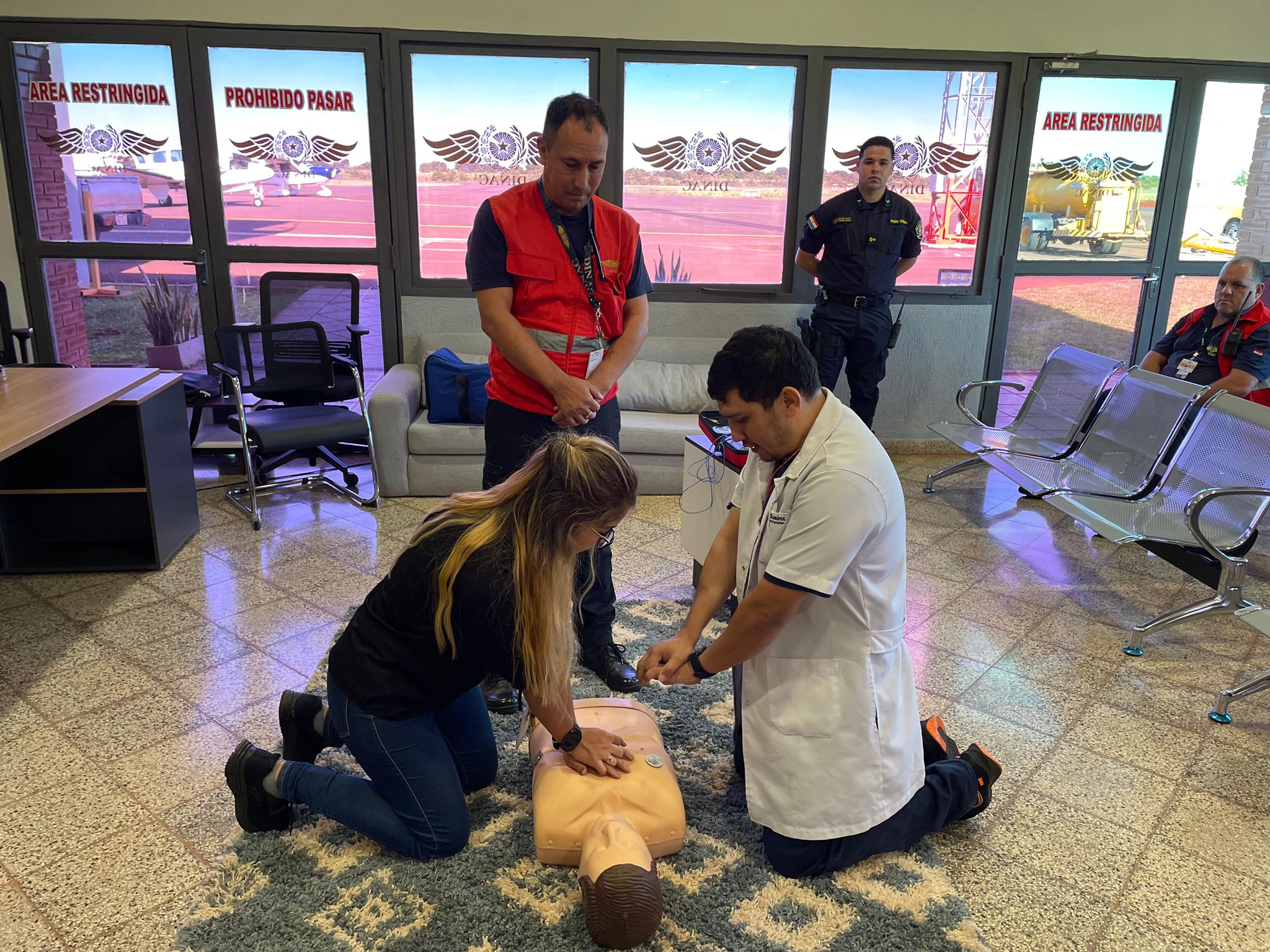 En el Aeropuerto Internacional Teniente Amin Ayub González se desarrolló un taller de capacitación en Primeros Auxilios, con énfasis en Reanimación Cardiopulmonar y el uso del Desfibrilador Externo Automático, dirigido a funcionarios de la terminal aérea, con el objetivo de fortalecer la respuesta ante emergencias médicas.