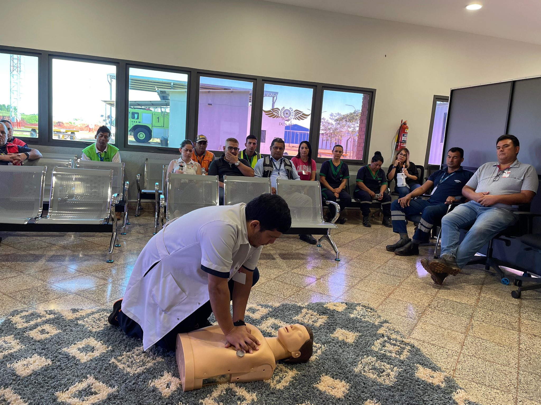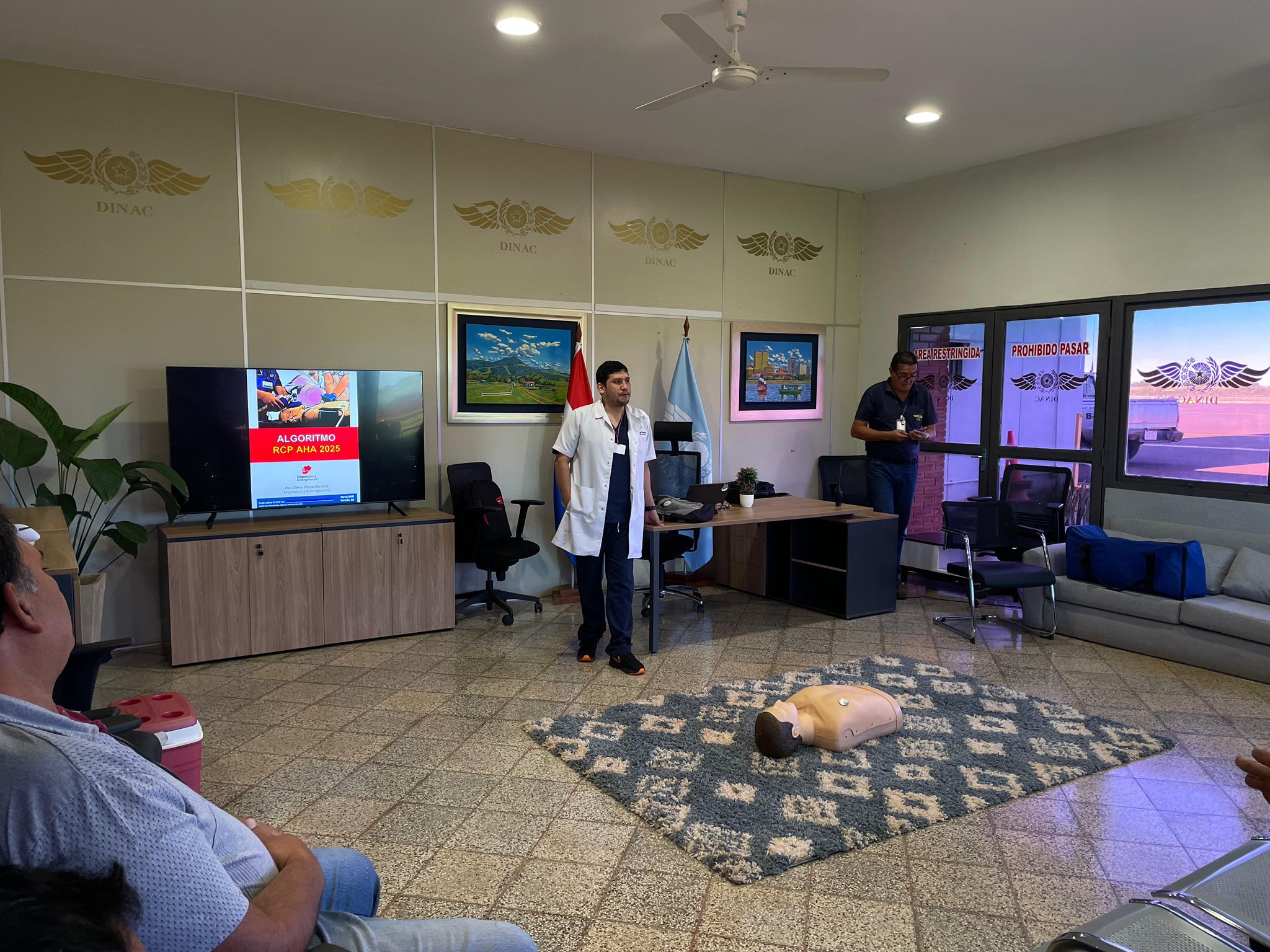 En el Aeropuerto Internacional Teniente Amin Ayub González se desarrolló un taller de capacitación en Primeros Auxilios, con énfasis en Reanimación Cardiopulmonar y el uso del Desfibrilador Externo Automático, dirigido a funcionarios de la terminal aérea, con el objetivo de fortalecer la respuesta ante emergencias médicas.